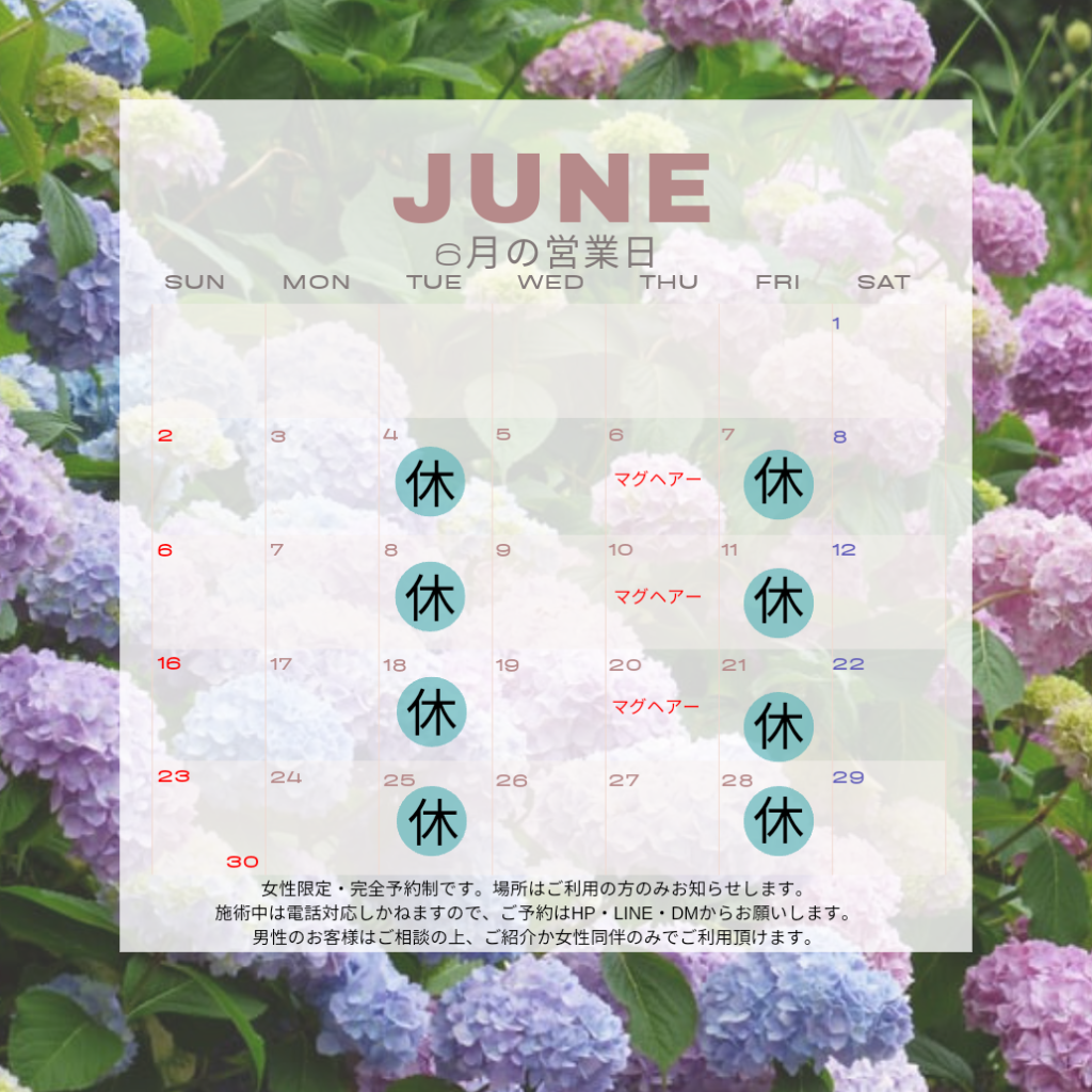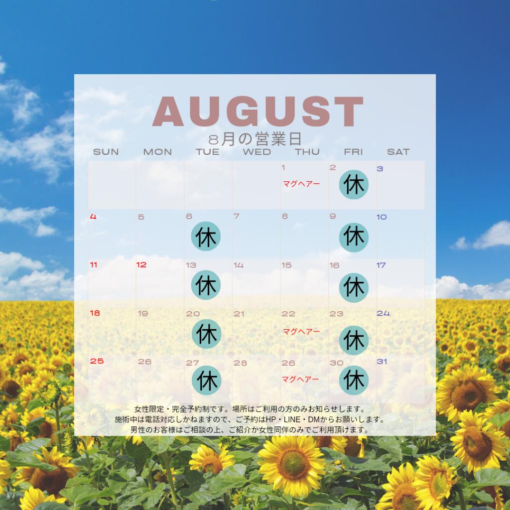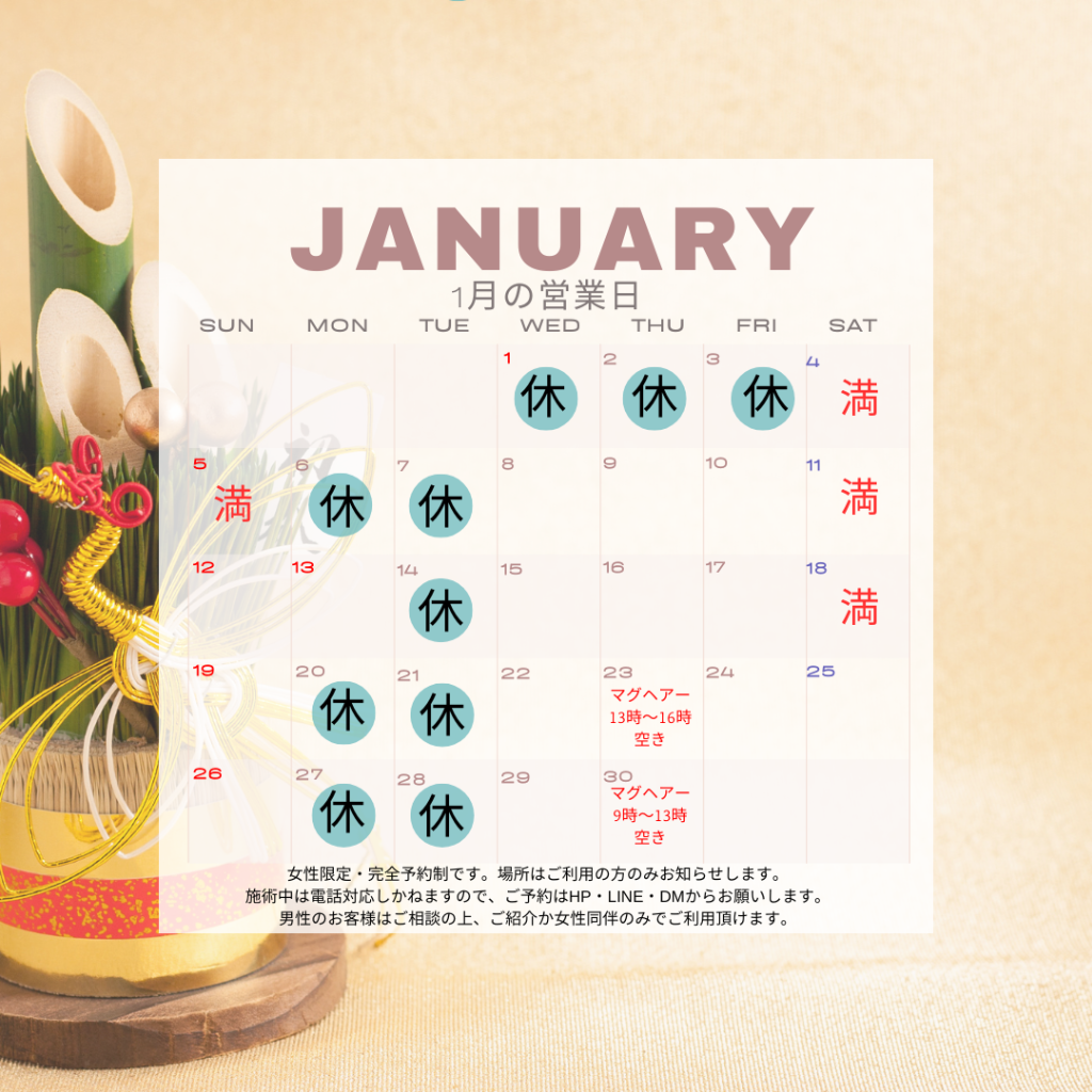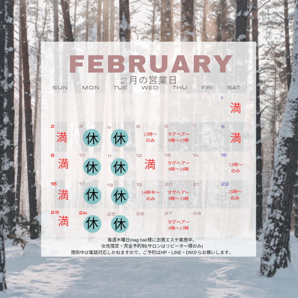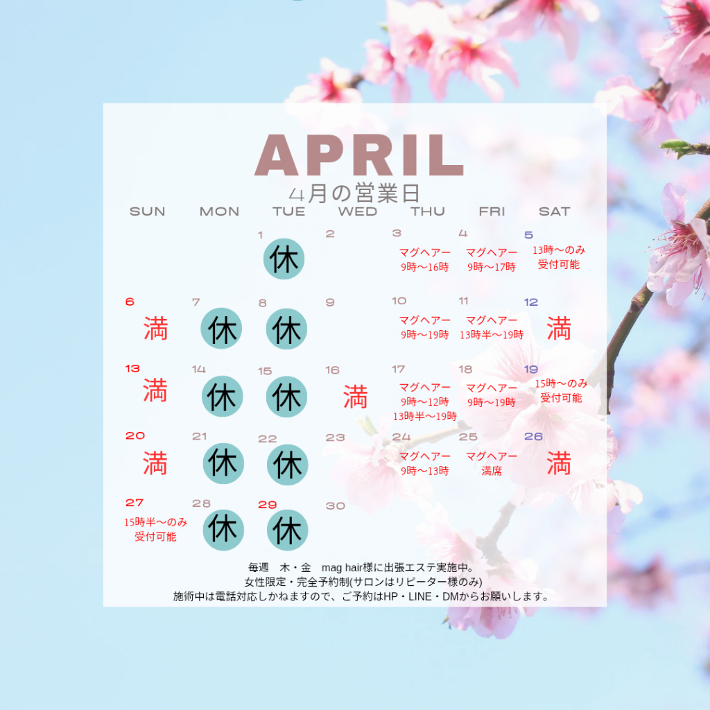 4月の営業日 2025/04/10 今月の営業日をお知らせします。これ以外にも臨時休業いたしますのでご了承下さい。小豆島で受けられるアロマテラピー、プライベートサロンで贅沢な時間をお過ごしください。 2月の営業日 2025/01/28 今月の営業日をお知らせします。これ以外にも臨時休業致しますのでご了承下さい。毎週木曜日「mag hair 」様にて出張エステ実施中。(サロンはリピーター様専用)施術中のお問い合わせはご対応いたしかねますので、HP ・LINE・DM にてご連絡下さい。小豆島で受けられるアロマテラピー、プライベートサロンで癒しの時間をお過ごし下さい。 1月の営業日 2025/01/01 今月の営業日をお知らせします。サロンはリピーター様専用です。ご新規の方は、HPから「mag hire 」様への出張施術へお申し込み頂きますようにお願いします。これ以外にも臨時休業致しますのでご了承下さい。小豆島で受けられるアロマテラピー、プライベートサロンで贅沢な時間をお過ごしください。 8月の営業日 2024/08/02 今月の営業日をお知らせします。これ以外にも臨時休業致しますのでご了承下さい。小豆島で受けられるアロマテラピー、プライベートサロンで癒しの時間をお過ごし下さい。 6月の営業日 2024/05/28 6月の営業日をお知らせいたします。これ以外にも臨時休業致しますのでご了承下さい。小豆島で受けられるアロマテラピー、プライベートサロンで癒しの時間をお過ごし下さい。 PREV 1 2 3 NEXT