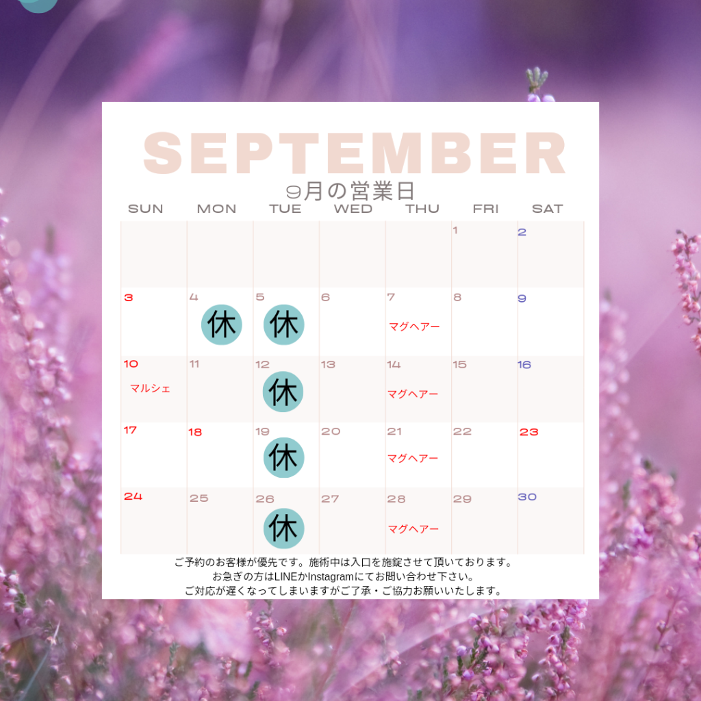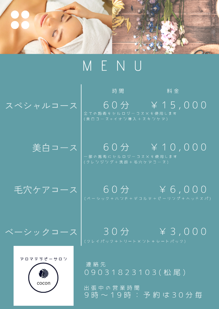 ※既にご予約頂いている方は、お次のお客様の開始時間の都合上、コース内容のご変更はお断りさせていただく場合もございます。