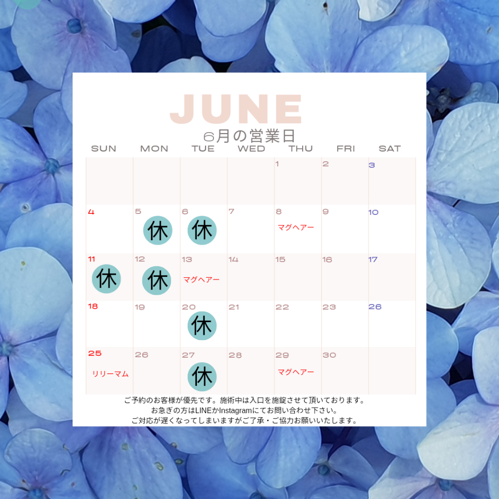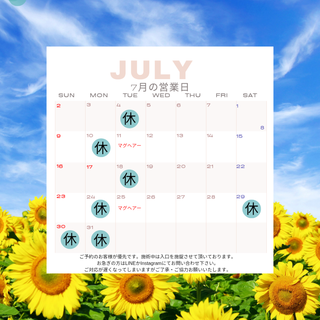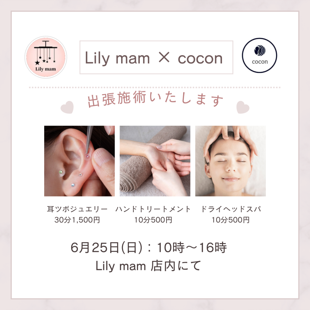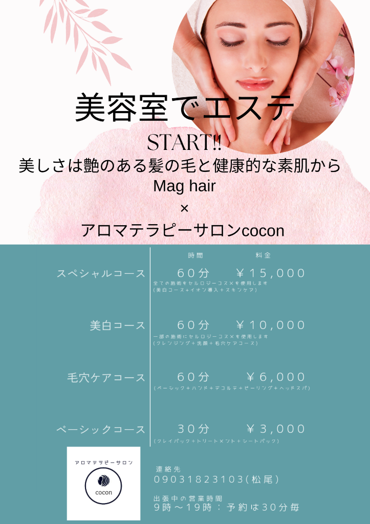 7月の営業日 2023/06/29 今月の営業日をお知らせします。これ以外にも臨時休業いたしますのでご了承下さい。小豆島で受けられるアロマテラピー、プライベートサロンで癒しの時間をお過ごし下さい。 平日割引 2023/06/15 2023年7月1日より「平日割引」を開始いたします。通常定価より500円お値引きされるお得な企画。ぜひ一度ご来店下さい。小豆島で受けられるアロマテラピー、プライベートサロンで贅沢な時間をお過ごし下さい。 イベント情報 2023/06/15 6月25日(日)高松市の韓国雑貨のお店 Lily mam 様で、出張施術いたします。耳ツボジュエリー・ハンドトリートメント・ドライヘッドスパを椅子に座ったまま体験出来ます。お問い合わせは当店かLily mam様へお願いいたします。小豆島で受けられるアロマテラピー、プライベートサロンで癒しの時間をお過ごし下さい。 美容室でエステ 2023/06/11 6月から安田の美容室Mag hair様でフェイシャルエステをしております。今月は8日13日29日の三回です。お気軽にお問い合わせください。小豆島で受けられるアロマテラピー、プライベートサロンで贅沢な癒しをお楽しみ下さい。 6月の営業日 2023/05/31 今月の営業日をお知らせします。これ以外にも臨時休業致しますのでご了承下さい。小豆島で受けられるアロマテラピー、プライベートサロンで癒しの時間をお過ごし下さい。 PREV 7 8 9 NEXT